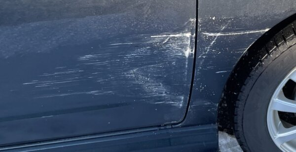 事故の状況自体は、書面で見るとよくある「停車中の車の側面に接触した事故」という形です。相手の車が凍結路でスリップし、運転席側のドアから前輪付近にかけて擦るように当たりました(上の写真のような傷跡です)。